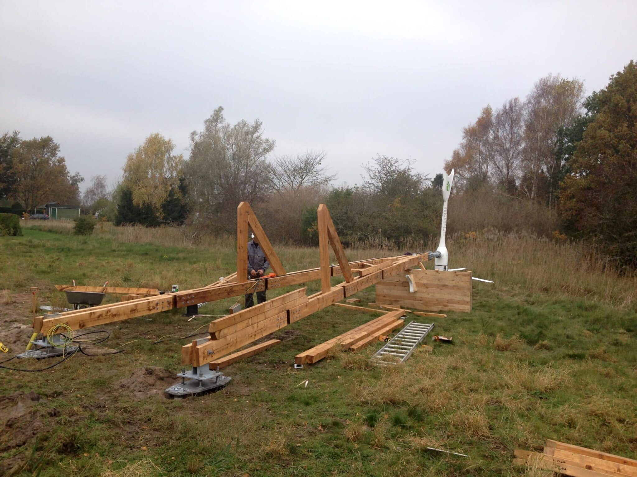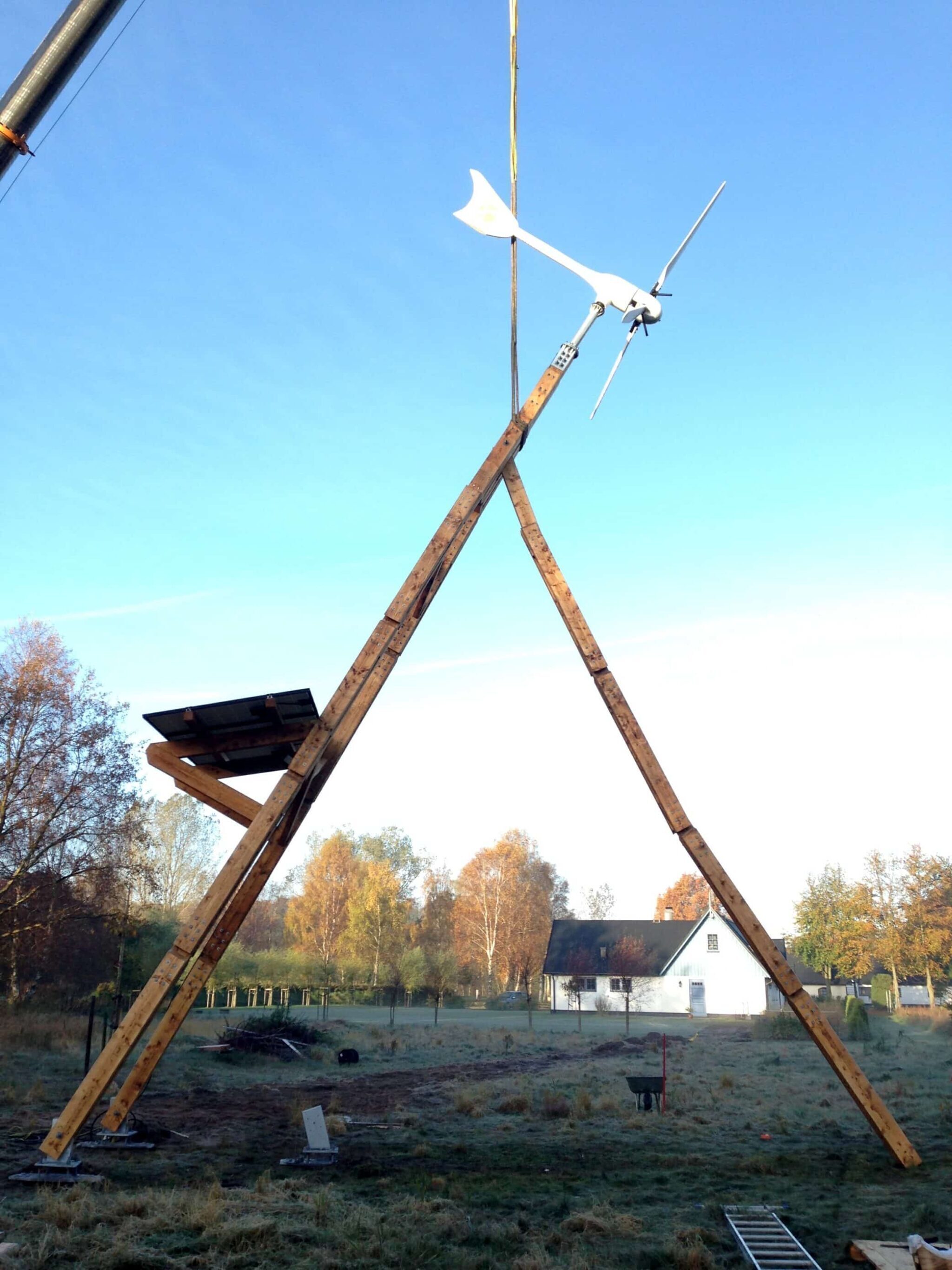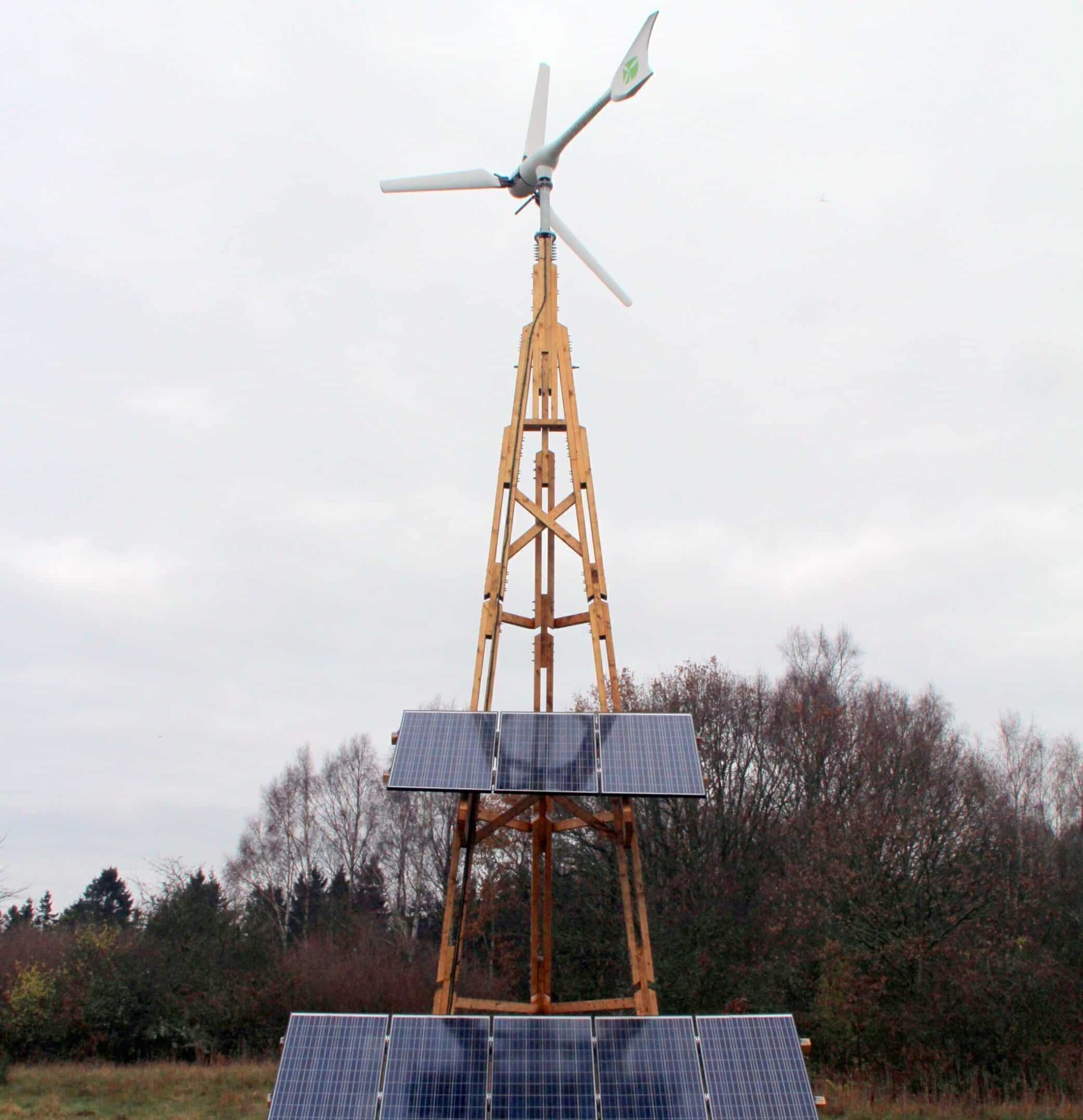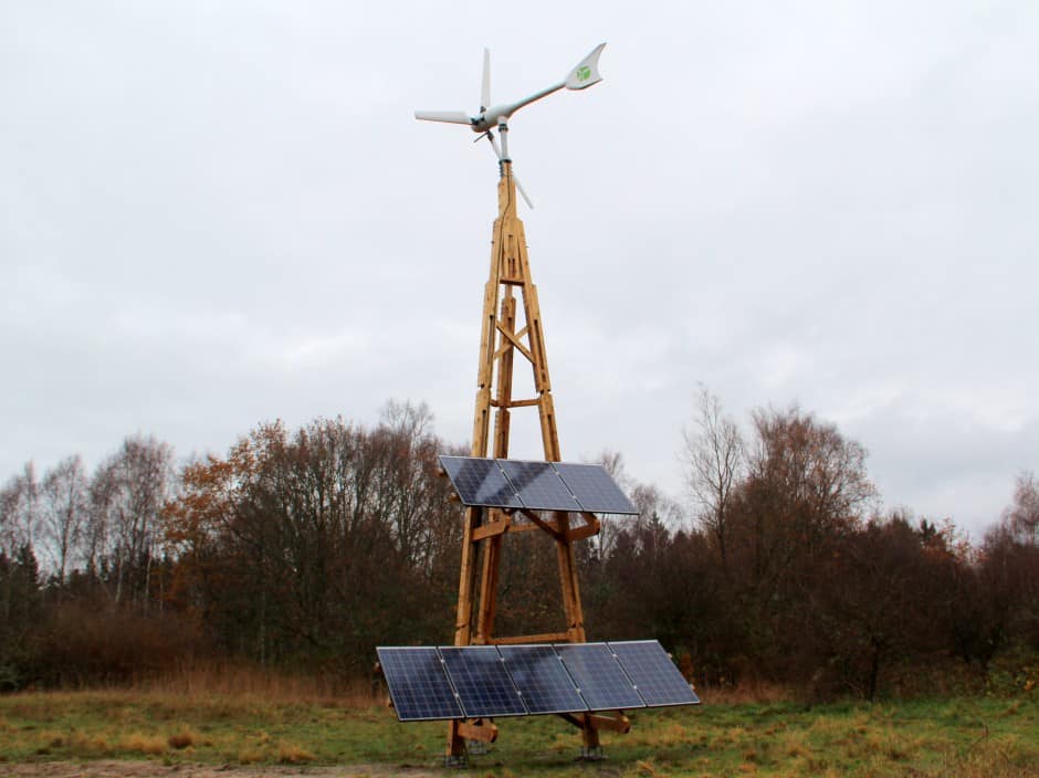 The Dali PowerTower installation took place in autumn 2014 at a private property in Skåne, Sweden. The installation location has moderate wind speeds and good insolation levels. Ground screws were used for the foundation anchoring each of the tower legs. The wood used for the Dali tower was Swedish pine with its surface treated with linseed oil (several layers applied). The wind turbine was a 3.5 kW machine made in Spain. There were eight solar panels installed on the tower to complement wind energy production.The electrical connection was made professionally by a local utility provider.